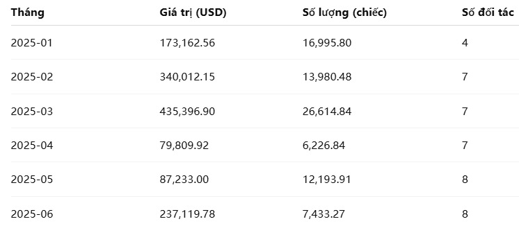 Dữ liệu cho thấy giá trị nhập khẩu dao động trong khoảng 79,000 – 435,000 USD/tháng, với mức cao nhất ghi nhận vào tháng 3/2025.