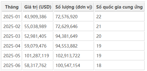 Tổng thể, kim ngạch nhập khẩu đạt đỉnh vào tháng 5/2025, với hơn 101,3 triệu USD, phản ánh nhu cầu mạnh mẽ trong mùa cao điểm sản xuất – đặc biệt là các ngành điện tử gia dụng và đồ gỗ xuất khẩu.