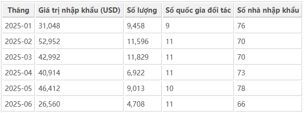 Trong nửa đầu năm 2025, hoạt động nhập khẩu cần gạt nước ô tô của Sri Lanka có sự phân bổ khá đồng đều giữa các tháng, không xuất hiện biến động đột biến lớn.