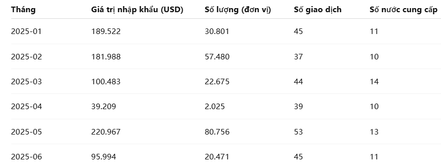 Quan sát xu hướng, tháng 5/2025 là thời điểm đạt đỉnh với hơn 220.967 USD, phản ánh nhu cầu mạnh mẽ của các nhà phân phối linh kiện ô tô trước mùa hè Nam bán cầu. Mức giảm nhẹ vào tháng 6 là sự điều chỉnh mang tính chu kỳ khi các đơn hàng bổ sung đã hoàn tất từ tháng trước.