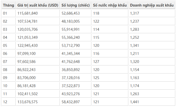 Dưới đây là bảng tổng hợp khối lượng và giá trị xuất khẩu theo từng tháng: